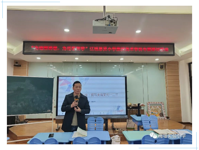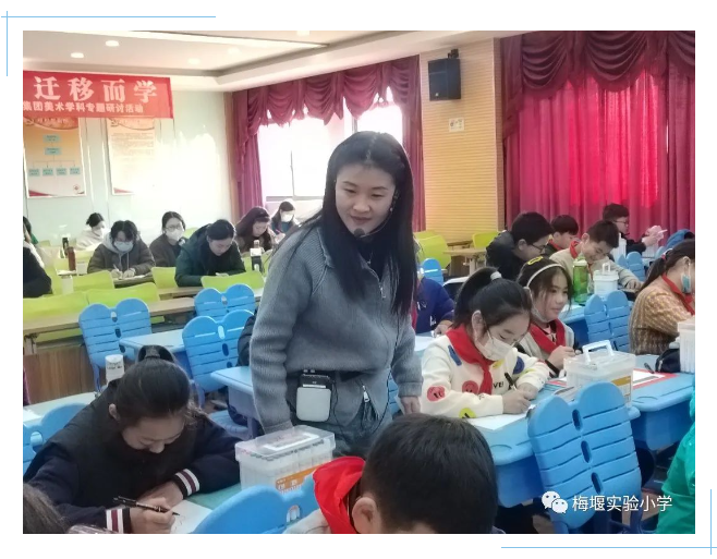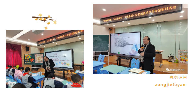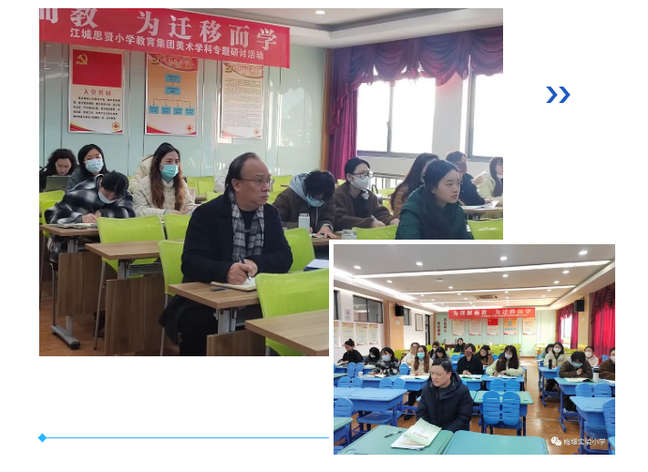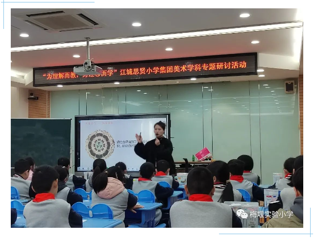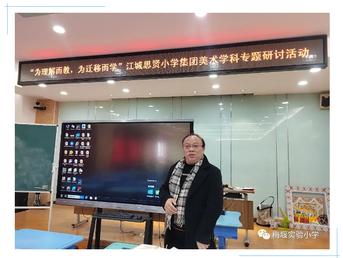 为探索新课标引领下的美术教学教研新模式、新方法,推动江城思贤小学教育集团成员学校美育工作交流,提升区域优质教育资源共享,12月5日“为理解而教,为迁移而学”江城思贤小学教育集团美术学科主题课堂研讨活动在梅堰实验小学举行。集团内8所学校近20位教师济济一堂汇聚元仁楼,吴江区艺术教研员王展鹏老师全程参与本次活动。