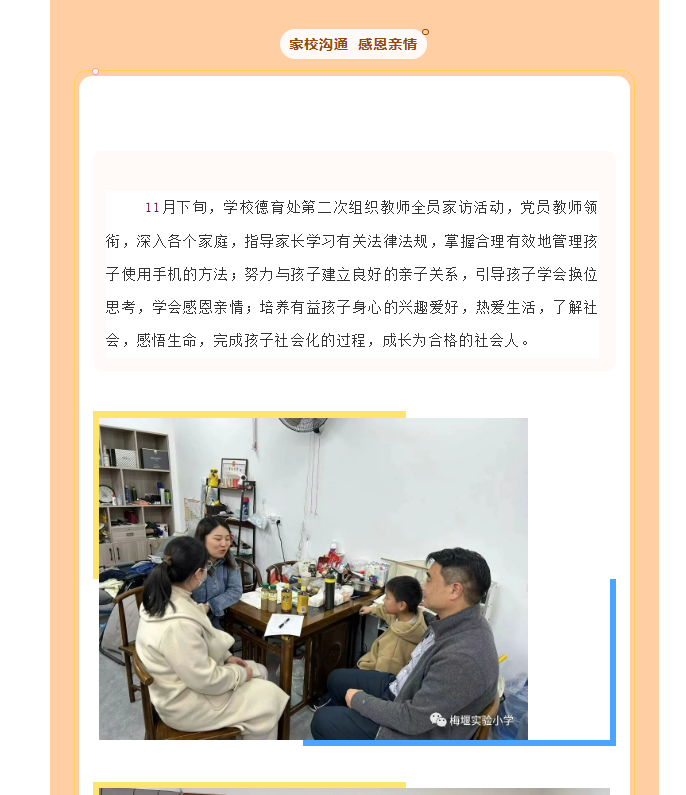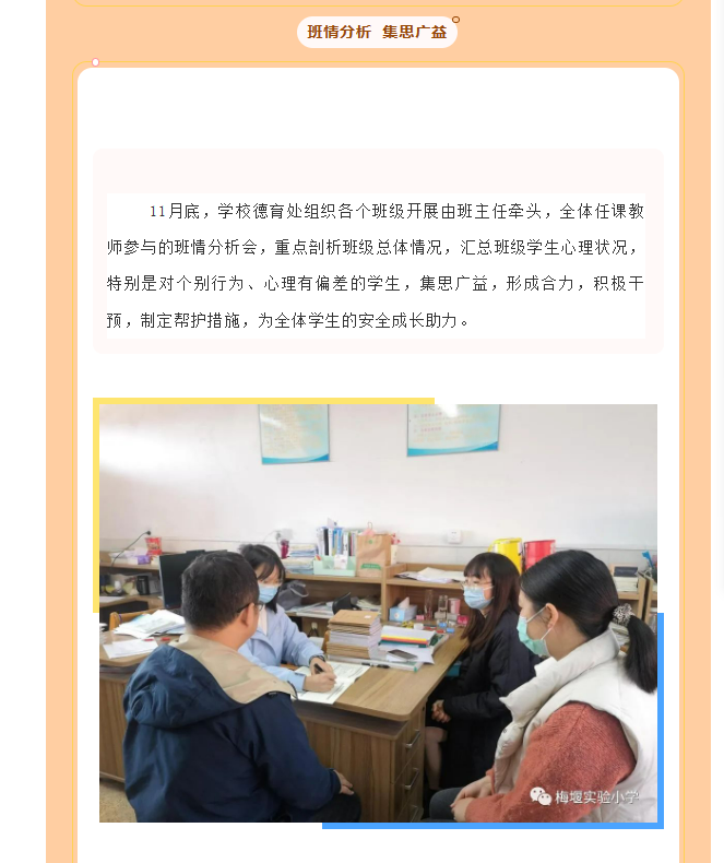 心理学家告诉我们:人的健康一半是身体健康,一半是心理健康。拥有健康的心理,才能拥有健康的人生。2023年11月,梅堰实验小学开展了“生命扬风采 成长心力量”为主题的生命教育专题活动,用心做好“七个一”,通过多种形式持续推进学校生命安全教育工作,促进学生身心健康,促进学生健康成长,预防心理危机事件的发生,让每一个孩子都能绽放生命的光彩。