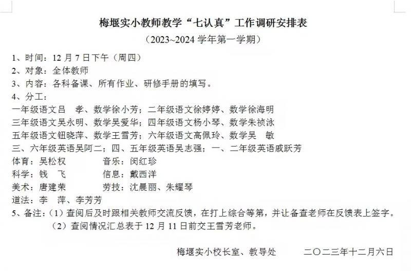 上周我校杨小琴校长参加了吴江区教研室对江村学校教育教学专项调研,教导处徐婷婷老师也被邀请一起观摩了本次调研活动。本次调研内容有:(1)课堂教学,当天根据课表随机圈课、听课、评课;(2)教学规范检查,检查“教学七认真”工作,对象为全体教师;(3)评估本校教研水平,主要查看教师“教研手册”填写;(4)师生访谈,了解学生的学习状态,了解学生学科学习生态情况。两位老师带来许多现场的一些消息,以此为鉴,我校组织了以此全面的“七认真”大检查,内容为所有老师的所有备课、作业布置和批改、研修手册等等,本次活动要求每位领导以书面的形式把检查情况反馈个每位备查老师,并要求对出现的问题进行限时整改,二次复查。