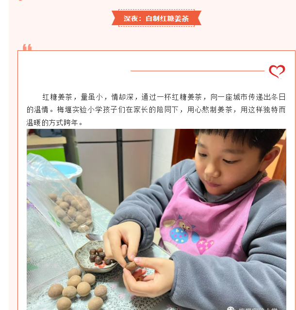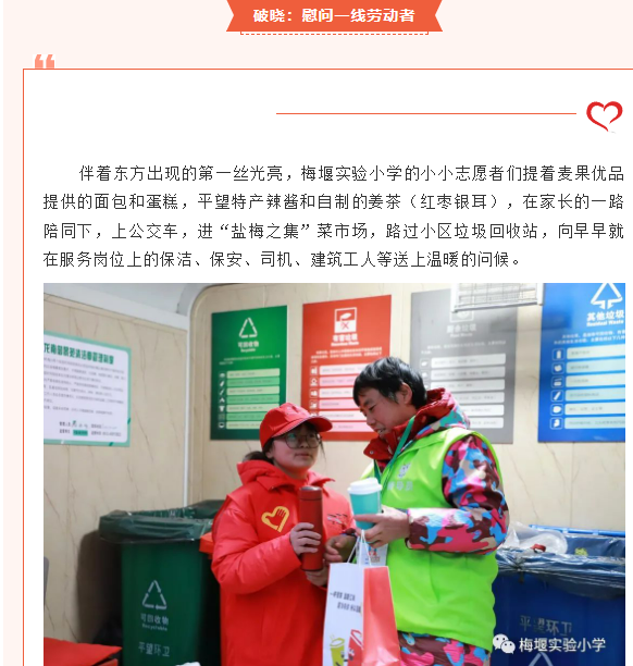 梅堰实验小学的学生和家长踊跃参与。一杯姜茶暖江城,孩子们在活动中学会尊重平凡而又伟大的劳动者,学会爱与付出,让公益改变童年。更希望孩子们懂得服务社会,懂得付出,尊重劳动,让孩子的成长不缺项。