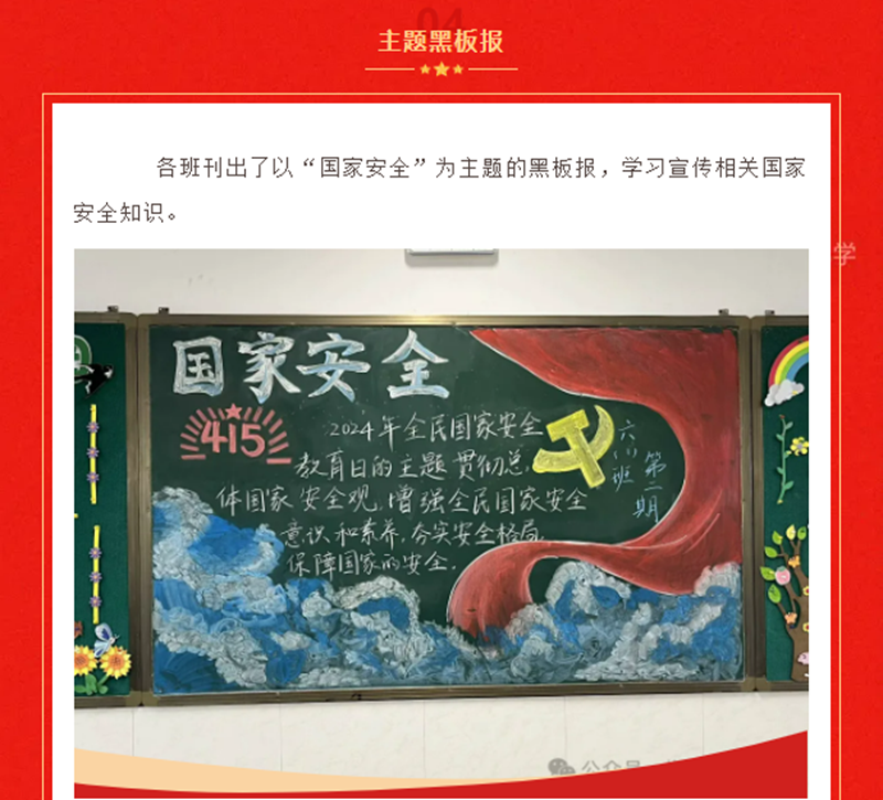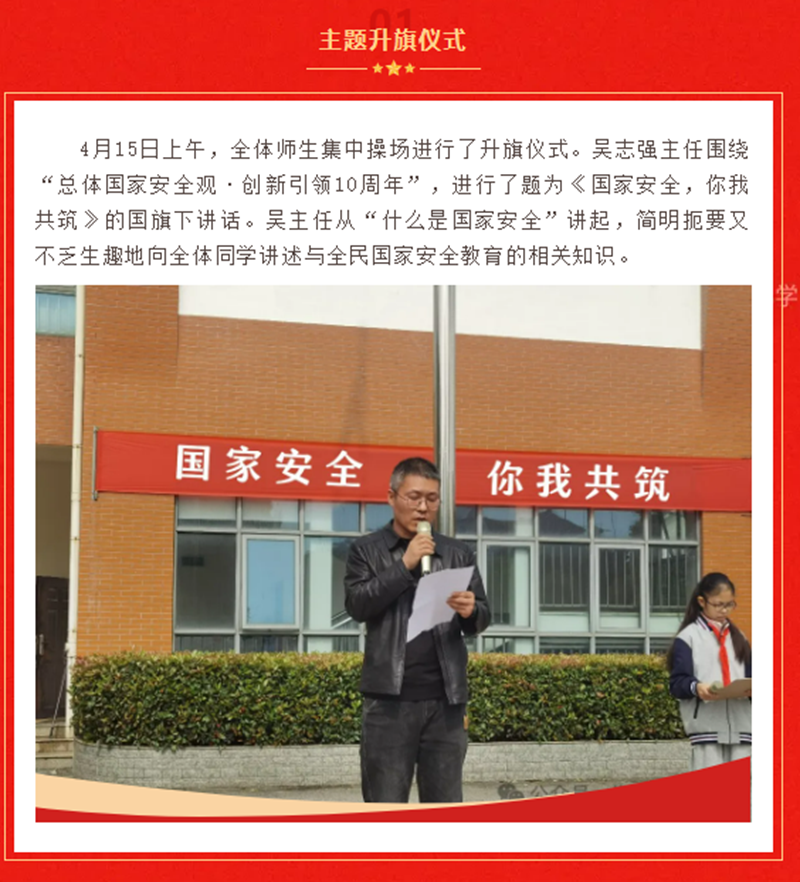 2024年是习近平总书记提出总体国家安全观10周年。4月15日是第九个全民国家安全教育日。为贯彻落实中央关于全面加强国家安全教育的重要指示要求,推动国家安全教育工作广泛深入普及,梅堰实验小学开展了“全民国家安全教育日”专题活动。