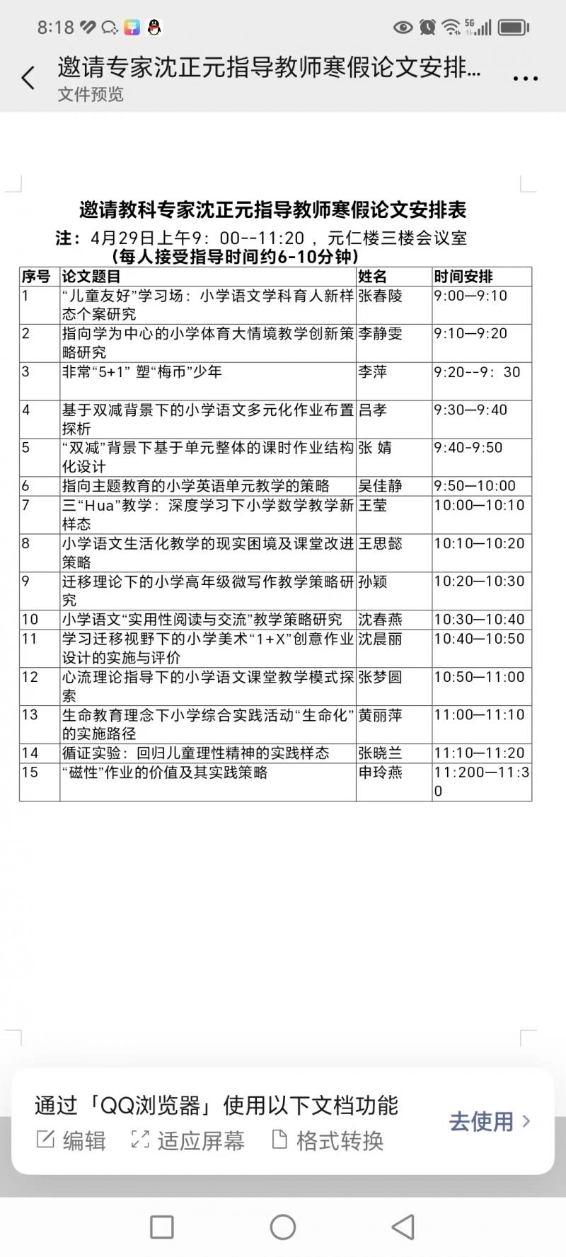 为有效推动我校教师参赛“省五大杯”论文评比,更好地促进教师论文撰写能力。4月29日,梅小教科室邀请吴江区教育局原副局长、资深教科专家沈正元老师给寒假论文获得一等奖的老师开展“一对一”现场指导。这是沈正元老师自1月份受邀给我校青年教师专题论文培训后,再次跟踪辅导青年教师论文写作。15位寒假论文一等奖老师有幸得到专家点拨与指导,获益匪浅。