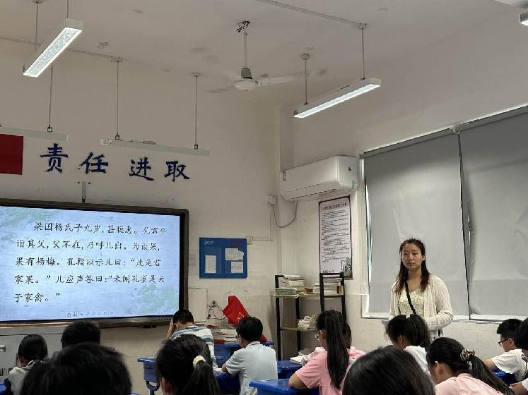 6月5日,青年教师孙颖上了《杨氏之子》,课前孙老师用心准备,借班先上了一次,由师傅给出指导意见,修改后再上自己班。这种自发的一课多磨行为,得到了大家的一致好评。