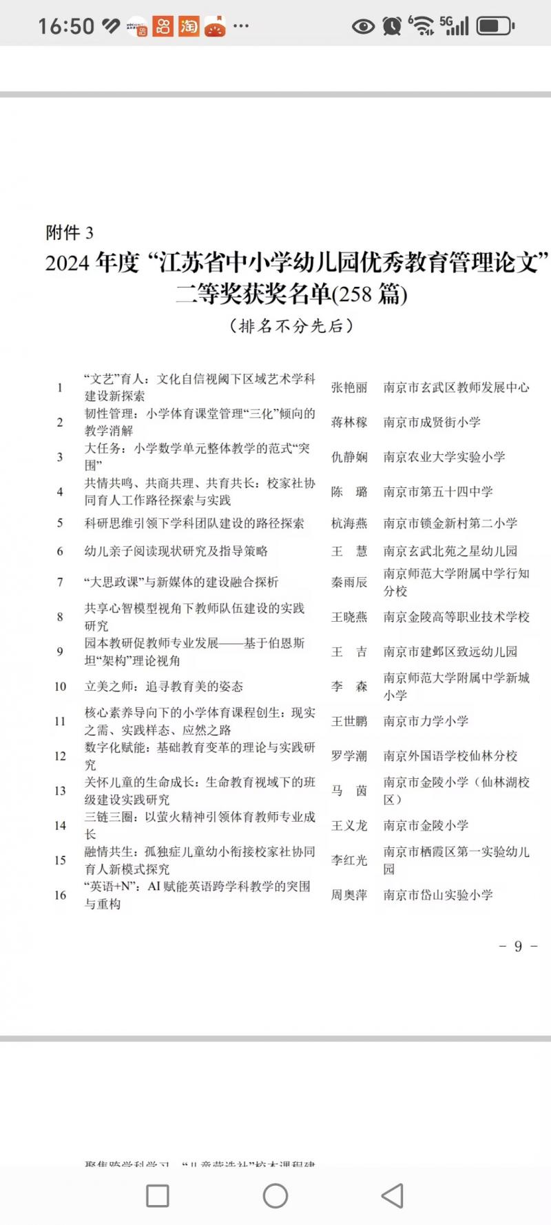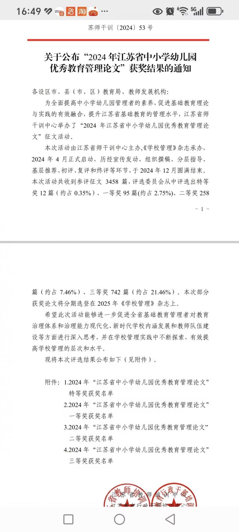 刚刚获悉,我校李萍老师撰写的论文在2024江苏省中小学幼儿园优秀管理征文中喜获二等奖。这是李老师三次改稿,默默付出,终于在五大杯论文中突围,祝贺李老师!相信李萍老师的撰写论文经历给我校青年教师更大的示范效益!期待通过本次活动,期待能激励更多的青年教师们主动参加各级论文大赛,争取早日获得教科成绩。
