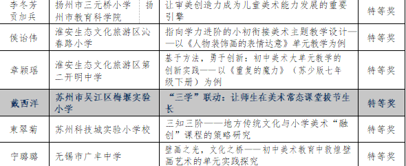 刚刚从省中小学教学研究室网站获悉:我校张晓兰、戴西洋老师的论文获2024年江苏省基础教育研究论文评比特等奖,这是我校从来没有过。据了解,整个吴江才4-5位教师获特等奖,可以说鼓舞了参赛老师的信心。通过本次比赛,激发了我校老师撰写论文的激情,鼓舞了信心。期待来年更上一层楼。