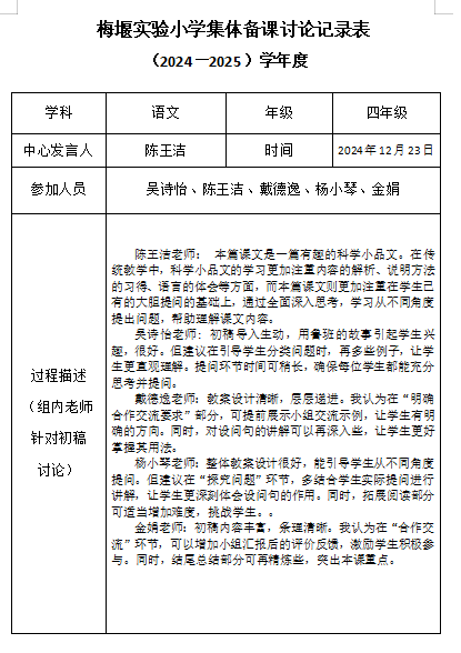 首先,集体备课能够让我们汇聚智慧,共同提升教学质量。在教学过程中,我们每位老师都有自己独特的教学方法和经验,但也难免会遇到一些难题和困惑。通过集体备课,我们可以相互学习、相互借鉴,将各自的教学经验和方法进行交流和融合,从而找到更加科学、有效的教学策略。这种集思广益的过程,不仅有助于我们解决教学中的实际问题,更能够激发我们的教学灵感,提升教学质量。