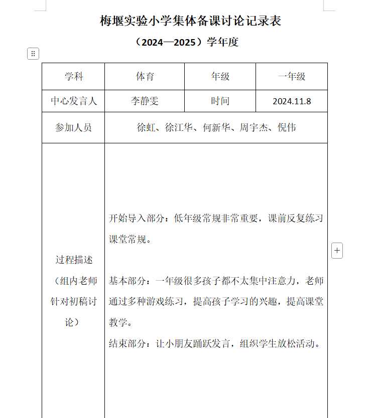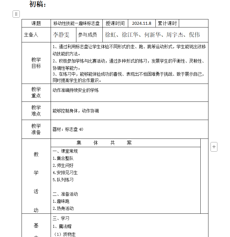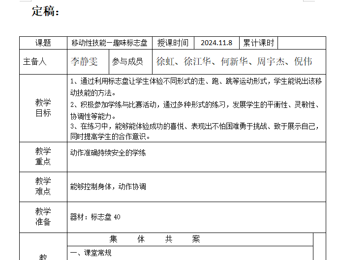 本学期体育组组织了一次集体备课,教师们积极参与讨论,它共同解决教学中遇到的问题,探索创新教学方法,为学生提供更优质的体育教育。针对具体教学内容,教师们分组讨论教学设计。针对李老师的课题:移动性技能—趣味标志盘,组内教师们提出多种教学方法,如采用小组竞赛激发学生竞争意识;设置不同游戏的体验环节,增加教学趣味性;利用标志盘摆放不同间距,让学生感受不同的移动练习,同时注重安全事项,如充分热身、检查场地器材、强调规则等,确保教学活动顺利进行。