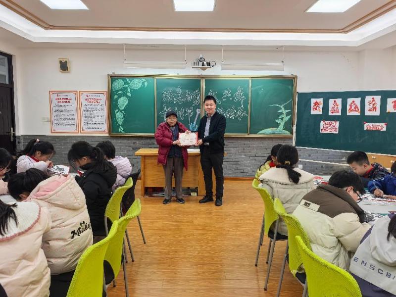 在活动中严校长为王老师颁发聘书,王老师将成为我们学校的“非遗剪纸校外辅导员”。