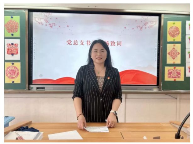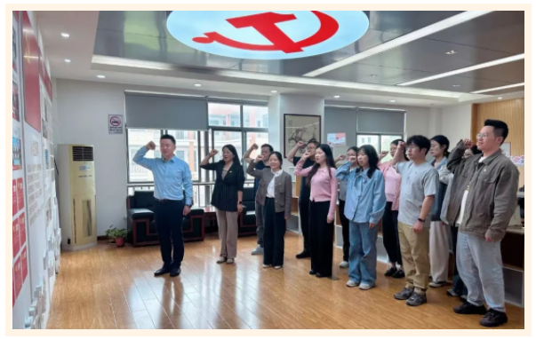 "我志愿加入中国共产党,拥护党的纲领,遵守党的章程,履行党员义务,执行党的决定,严守党的纪律……"严卫强校长的领誓声中,全体党员面对党旗重温入党誓词。