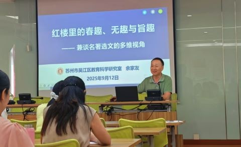 9月12日下午,梅堰实验小学特邀吴江区教育科学研究室余家友主任,为全体语文教师开展题为《红楼里的春趣、无趣与旨趣》的语文教学专题讲座。余主任以“古典名著如何进入中小学教材”为切入点,系统剖析《红楼梦》选文的时代、人文及课程价值,指出其深厚的育人功能。同时,他直言当前教学中存在的“选文断裂、人物错位、图文不符”等实际问题,强调应避免“东施效颦”“面目全非”的误导性解读。最后,他引导教师聚焦“红楼旨趣”,把握文学本质与教学实效的统一。讲座内容详实、见解深刻,为我校语文教师提供了古典名著教学的新思路与新方法,参与教师纷纷表示受益匪浅。