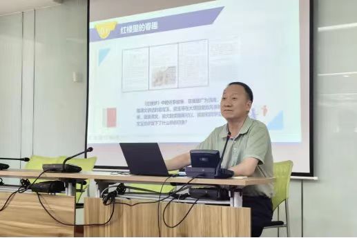 接着,吴江区教育科学研究室原主任余家友以《红楼里的春趣、无趣与旨趣》为题开展专题培训。他围绕“古典名著如何进入中小学教材” 展开论述,系统剖析《红楼梦》选文所蕴含的时代价值、人文内涵与课程意义,深刻揭示其浸润心灵的育人功能。他引导教师聚焦 “红楼旨趣”,在教学中实现文学本质与教学实效的有机统一。整场讲座内容翔实、见解独到深刻,为令老师们深感 “耳目一新”,获益匪浅。