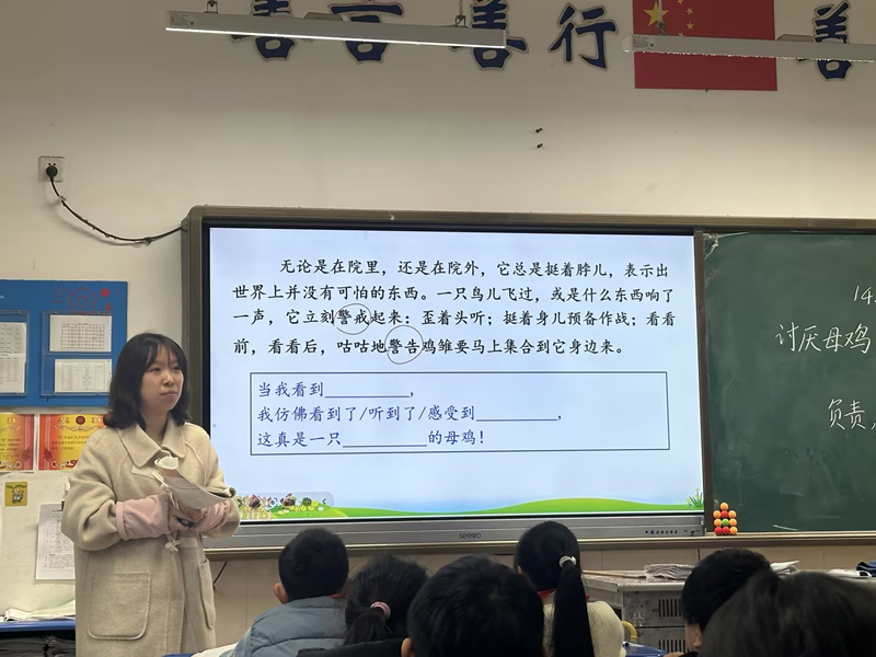 活动伊始,由沈老师展示四年级散文《母鸡》公开课。课堂上,沈老师以“作者情感变化”为主线,紧扣文本“先抑后扬”的表达特点,引导学生圈画关键词句,对比品读母鸡前后形象的转变。通过多样的朗读形式、精准的追问引导,学生在自主探究与合作交流中,既读懂了母爱的伟大,又掌握了文本解读的方法。课堂层次清晰、师生互动高效,充分展现了扎实的语文教学功底。